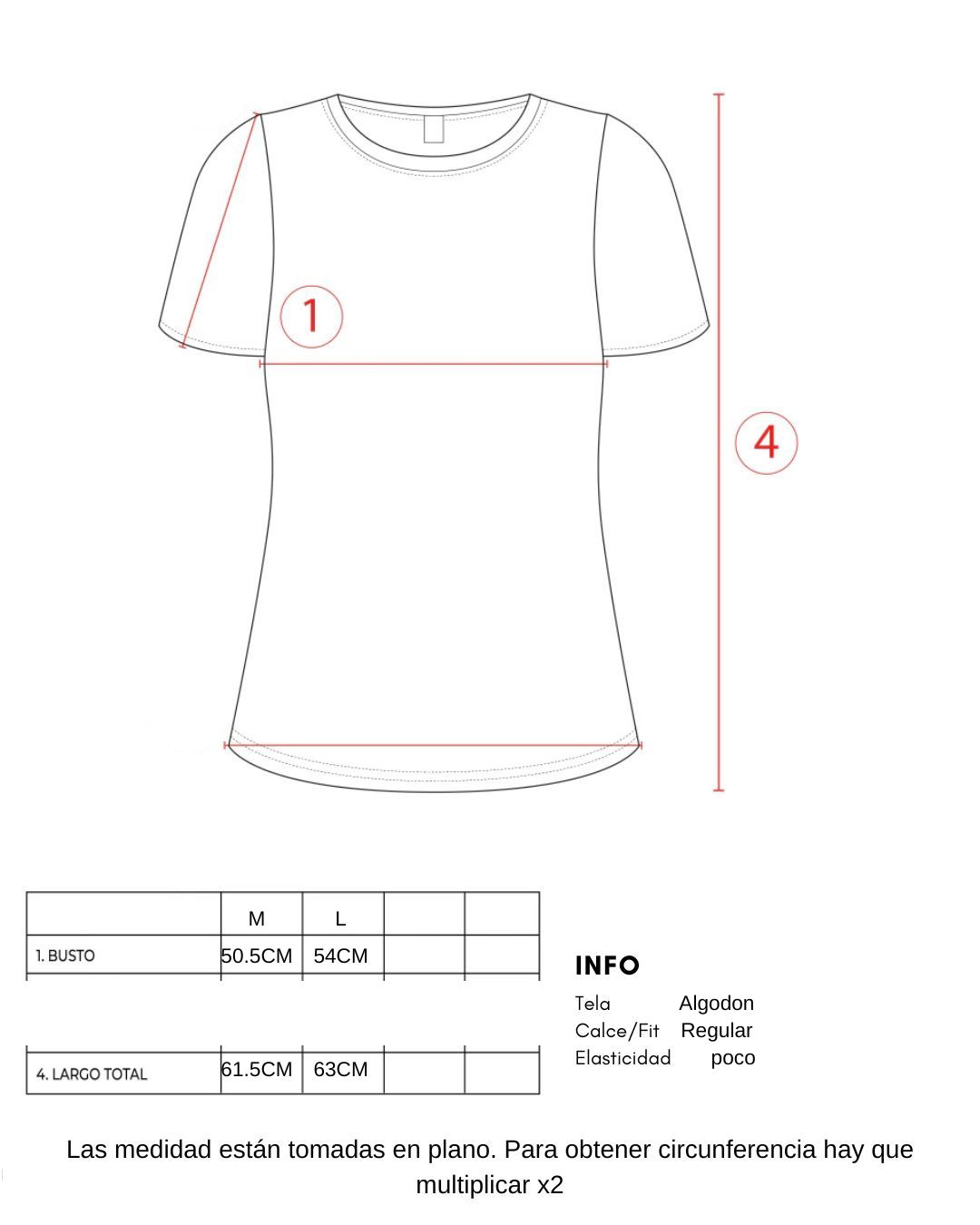 Disponible en talle M y L, con medidas detalladas para que elijas la que mejor te queda: - Talle M: ancho de busto 50.5 cm / largo 61.5 cm - Talle L: ancho de busto 54 cm / largo 63 cm